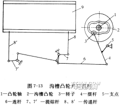 溝槽凸輪開口機構為另一種積極式凸輪開口機構,其傳動過程如圖7-13所示。當凸輪從小半徑轉向大半徑時,綜框上升,此時溝槽內側受力;反之,凸輪從大半徑轉向小半徑時,綜框下降,此時溝槽外側受力。在此機構中,綜框的升降運動都是積極的。