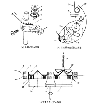 它是一種設計比較合理的張力裝置,第一組張力盤起減震作用,第二組張力盤控制紗線張力。紗線