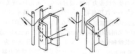 這種張力裝置的設置主要是為了調節片紗的張力均勻程度,如圖3所示,筒子架每排設有一套導紗棒式張力裝置,紗線自筒子引出后,經過導紗棒1、2,繞過紗架立柱3,再穿過自停鉤4而引向前方。通過調節導紗棒2的位置來調節導紗棒1、2間的距離大小,從而調節紗線對導紗棒的包圍角來改變和控制經紗張力,它只能調節整排經紗張力,不能調節單根經紗的張力。