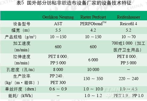 RieterPerfojet公司的PERFObondTM紡粘非織造布生產線可在低能耗、靈活工藝配置下生產出高品質產品,單絲直徑10~40ìm,MD/CD接近1。在PET紡絲成網中,紡絲速度達5000~6000m/min,每24h斷絲最多不得超過1次。在高品質、低能耗條件下,提高生產效率是人們關注的重要方面。如OerlikonNeumag公司的AST型生產線在紡制PET產品時,最多可提供3組箱體,拉伸速度8000m/min,生產線速度600m/min,噴絲板孔密度8000孔/m。而它提供給意大利Albis公司的紡粘非織造布生產線是世界上幅寬最大的紡粘生產線,達7m。表5是幾種具有代表性的紡粘設備的性能。