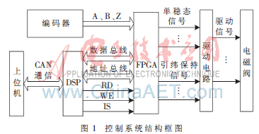本文所提出的噴氣織機新型引緯控制系統結構圖如圖1所示。采用DSP控制單元與上位機進行串行通信、與FPGA進行并行通信,以實現引緯參數的實時調整;FPGA可編程邏輯單元通過比較編碼器的角度信號和設定角度信號產生引緯單穩態和保持信號;引緯單穩態和保持信號通過驅動電路控制電磁閥的動作。