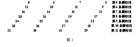 在花型小樣上確定花型的高度、寬度和使用的梳櫛梳櫛數,并進行梳櫛分配。不同的梳櫛橫移線使用不同的顏色表示。每一條橫移線的導紗梳櫛一般分配在花紋循環的整個寬度,花梳呈交錯配置,例如MRES33花梳分配如圖1所示。這樣可以避免與另外一個導紗針相撞。另外,花型設計人員應該了解不同多梳機器的技術可能性。例如: