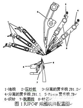 RJPC 4F 賈卡經編機由地梳( 1 )、壓紗板( 2 )、分離的賈卡梳 JB1.2 ( 3 )、分離的賈卡梳 JB1.1 ( 4 )、 Piezo 賈卡梳 JB ( 5 )、織針( 6 )、脫圈梳( 7 )和針芯( 8 )組成。該機采用復合針,并且單針插放。針芯采用 1/2 英寸寬度的針塊。采用組合式賈卡梳櫛,由兩個分離的賈卡梳 JB1.1 和 JB1.2 組合而成。所有成圈機件都由封閉油箱中凸輪或者曲柄控制。 RJPC 4F 賈卡經編機的賈卡梳僅作橫移,不作擺動;壓紗板作上下運動, 3 把地梳既擺動又橫移。