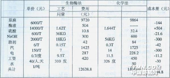 表7 兩種脫膠方法噸精干麻成本核算比較