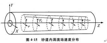 旋轉氣流的中心壓力低于外層壓力,形成負壓,加上旋轉氣流的軸向分速度作用,吸嘴具有一定吸力,使前羅拉輸出的纖維能順利吸人加捻器吸口中。紗道內渦流場的速度分布由切向速度、軸向速度和徑向速度組成,如圖4—15所示。