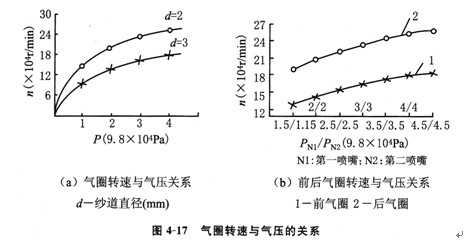 實驗證明氣圈轉速隨氣壓增加而加快,如圖4—17所示(測試條件:紡13.1tex、65/35T/C紗,紡紗速度140m/min,喂入比0.98)。