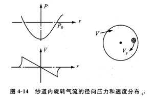 噴氣紡紗中,噴射氣流在紗道內旋轉流動,其實質為氣流渦流流動。根據渦流理論,當紗道內無紗條時,其徑向壓力和速度分布如圖4—14所示。