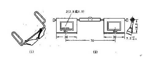 2.皮圈銷皮圈銷的作用是固定膠圈位置,把上、下膠圈引至前鉗口,并在膠圈銷處形成彈性鉗口。FA506型細紗機采用彈性擺動上銷和T形下銷,如圖7—2—3所示。下銷為6錠一根,固裝于下羅拉座上,在張力輥的彈簧作用下,與下部張力輥一起支撐下膠圈,使其呈緊張狀態(tài)。上銷為雙聯(lián)葉片狀,用于支撐上膠圈,其上端可繞小鐵輥中心靈活擺動,借助小鐵輥中心處片簧的作用給上銷施加一定的起始壓力,使上銷始終壓向下銷。上銷上裝有尼龍隔距塊,使上、下銷間保持一定的隔距,通常稱原始隔距。
