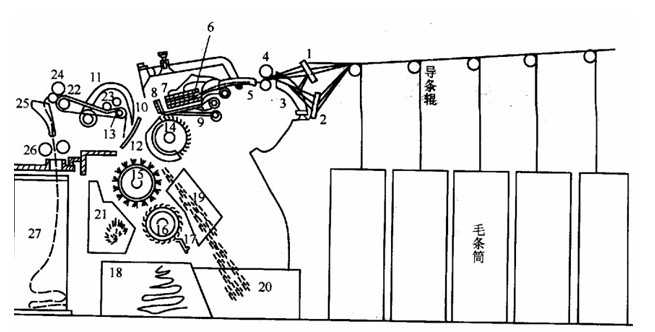 1. 組成喂入機構:包括條筒喂入架、導條板、喂給羅拉、給進 盒、給進梳。