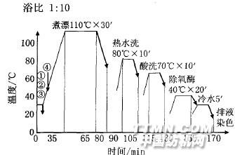 我們知道棉纖維中含有6%~10%的雜質,如蠟狀物質、灰分、含氮物質、有機酸、果膠質、多糖類等。棉前處理的目的是去除棉纖維中的雜質,使棉獲得良好的潤濕性,便于后道的漂白與染色。傳統的棉及其混紡紗線通常采用NaOH、H2O2,煮漂工藝,由于大量使用堿,處理后又需加酸中和,多次漂洗,不僅工序繁雜,而且加重污水處理負擔又對紡織品強力造成損傷。生物酶精練技術是對傳統前處理工藝的突破,是一種全新溫和的綠色的精練方式。生物精練利用酶的專一性,有效分解去除果膠質及其共生物雜質,從而達到精練效果,纖維本身并未受到損傷。因此,經生物精練的棉纖維能最大程度地保持纖維強度, 失重小,手感柔軟富有彈性。CBS酶是無錫市德冠生物科技有限公司生產,用于纖維素纖維前處理的多功能混合酶,其中的果膠酶消化棉角質層的果膠,纖維素酶則消化棉角質層中間的纖維素初生胞壁,堿性脂肪酶分解天然脂肪酸及酯類污物。由于果膠位于纖維與蠟質之間,將蠟質粘合在纖維上,果膠質的去除使得棉蠟質在表面活性劑的滲透、乳化和凈洗的作用下去除,多種酶的協同作用起到精練效果,提高棉纖維的潤濕性能。l 實驗內容1.1實驗材料及設備紗線:23.3tex(50s/2)精棉、29.1 tex(40s/2)絲光棉、16.6tex(70s/2)絲光棉40s/1(14.6tex)棉/絹/麻(20/40/40)染化料助劑:精練酶CBS(德冠生物科技)、滲透劑LFD一30(上海雅運)、精練劑sss(上海雅運)、精練劑SF-1(寧波新科)、氧漂穩定劑HG一2000(寧波新科)、片堿(工業用)、雙氧水(27.5% ,工業用)、除氧酶DTX(蘇州祥源)、醋酸(98%, 工業用)、純堿(工業用)、燒堿(48%,工業用)、鹽(工業用)、永光H型活性染料、科華素活性染料、勻染劑DY(上海佳和)等。設備:常溫振蕩式小樣機、YGO20B電子單紗強力機、Y571-A摩