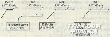 織物: 330g液量: 10L退漿: α-淀粉酶(超濃)lOg/L 表面活性劑0.5g/L精練:氫氧化鈉 2g/L表面活性劑 0.5g/L漂白: 過氧化氫 600mL/m3 硅酸鈉 2g/L 氫氧化鈉 1g/L 表面活性劑0.5g/L使用機械: 回轉釜染色機 圖3 18堿漂白工藝過程 表3-47漂白液中的過氧化氫濃度和漂白織物白度