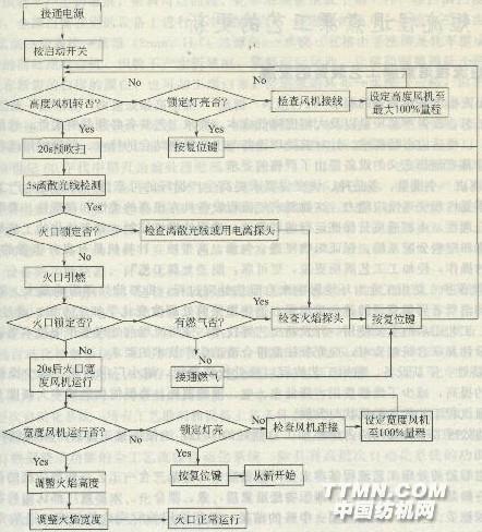 圖3-6 自動控制火焰高度、幅寬啟動流程 JD型及YM一602型電熱接觸燒毛單元機,皆具有自主知識產權,獲國家專利證書。燒毛接觸面溫度在800~850℃;去除小棉結效果非常明顯;單元機具有加工幅向左右加壓微調機構,有效調節布面燒毛的均勻度;單元機設有升降式保溫裝置,使圓筒表面的清潔工作更易操作;加熱功率PID控制,動態過程呈平穩升降溫;燒毛成本大幅度下降。 電熱接觸式燒毛符合清潔生產要求。 國內對燒毛火口的研究已達到國際先進水平。國產燒毛機的XH型、MJ型火焰噴射式火口,以及FC型復合式燒毛精加工火口、YSC外加熱接觸式燒毛單元均成績斐然,皆步入國際先進行列。然而,在機電一體化技術的應用方面,與國外先進機臺相比仍有差距。例如德國奧斯托夫(Osthoffsenge)公司早已開發了計算機程序化燒毛操作裝置,該裝置采用織物表面茸毛檢測器與Seng-matie型程序控制器組合。操作者只需設置坯布纖維的成分和組織結構、質量,該系統就可提供一個相應的燒毛程序,對火焰溫度、布面溫度、燒毛均勻度、燒毛火口位置及布速等參數實施程控。其工藝程控系統排除了人為的隨意性,屏幕顯示的人機操作界面友善燒毛效果重現性好,
