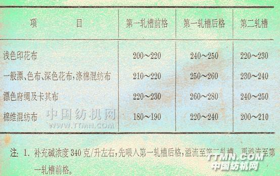 織物進(jìn)入絲光機(jī)后,首先經(jīng)第一軋堿槽軋堿,為了延長棉織物帶堿時(shí)間以及防止棉織物發(fā)生收縮,出前軋堿槽后便經(jīng)繃布輥繃布,再進(jìn)入后軋堿槽中軋堿。織物從進(jìn)入前軋堿槽到出后軋堿槽,歷時(shí)約30-40秒;絲光機(jī)的兩個(gè)軋堿槽是相互連通的,以便堿液的流動(dòng)。絲光時(shí)堿的濃度如下所示: