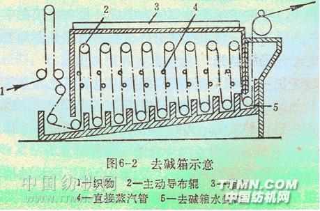 為了進(jìn)一步去除織物上的燒堿,經(jīng)過伸幅淋洗這后,便進(jìn)入洗堿效率較高的去堿箱去堿。去堿箱結(jié)構(gòu)示意圖如下所示: