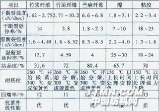 0 前言 竹纖維可分為竹原纖維和竹漿粘膠纖維(屬再生纖維素纖維)兩種。竹漿纖維是利用化學方法制成竹漿粕,再進行噴絲而成;竹原纖維則是利用物理、機械及化學加工,不破壞竹材纖維素結構,只去除纖維素束內外木質素、蛋白質和果膠等,再從中提取竹纖維,可最大限度地保留竹纖維的特性,是一種新型的綠色環保纖維素纖維。 表1竹原纖維和其它紡織纖維性能比較