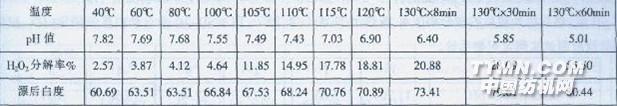 以上試驗表明,力威龍198對pH值的影響不明顯。即使在溫度達到130℃時,pH值是相對穩定的。同時表明該產品在高溫時具備優異的穩定性,不會因溫度的升高或時間的延長而影響工作液的穩定性。 (2)、試驗漂浴(27.5%H202:5 g/L力威龍198:1.5g/L,用純堿調節pH值至9.00 1OgCVC胚布,浴比1:15)經不同溫度處理后測試其工作液pH值和滴定法測試H20:的分解情況(織物上的H202殘留量變化百分率%)具體列表如下: