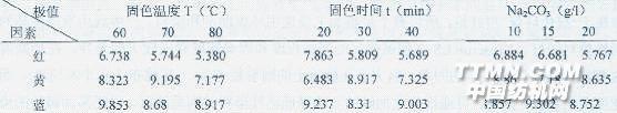 通過K/S值我們可以得出其極值,并通過極值對實驗結果進行分析得出固色階段的最佳工藝。 表7