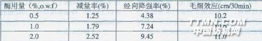 1.實驗 1.1 實驗試劑與材料:新纖L-10(上海康地恩生物科技有限公司),醋酸,醋酸鈉為分析純,純棉布 1.2 實驗儀器 FA2004電子天平,HHS電熱恒溫水浴鍋,DZF-6050真空干燥箱,PHSJ-4A實驗室PH計,YG026斷裂強度測試儀,YG8 11型懸垂測試儀 1.3 生物拋光工藝 配制纖維素酶溶液→調(diào)節(jié)pH值→升溫至所需溫度,加入織物→處理一定時間→取出織物→80℃熱水洗10min→105℃烘至恒重_測定織物性能指標。 1.4 性能測定 減量率的測定:將纖維素酶處理前后的試樣在烘箱中于105℃烘干至恒重。減量率=(M處理前-M處理后)/M處理前×100%;斷裂強力的測定:在YG026斷裂強度測試儀測定。降強率=(處理前斷裂強力-處理后斷裂強力)/處理前斷裂強力×100%;毛細效應(yīng)的測定:蒸餾水(含0.5%重鉻酸鉀)在30min內(nèi)沿織物(經(jīng)25cm,緯4cm)所上升的高度;懸垂系數(shù)測定:在YG811懸垂測試儀上測定。2結(jié)果與討論 2.1 單因素實驗 2.1.1 酶用量的影響 棉織物在溫度50℃,pH值5.0,時間50min,浴比1:15條件下,改變酶的用量進行生物