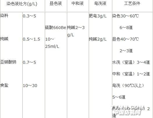 (一)可溶性還原染斜性能及染色過程 可溶性還原染料在水中的溶解度與分子結構中所含可溶性基團的多少有關,可溶性基因越多,其溶解度越大,加入電解質,會降低溶解度,增加染料的上染率。可溶性還原染料染色分兩步完成,第一步是染料對纖維的吸附、上染;第二步是染料在纖維上的水解、氧化,即染料的顯色過程。當織物浸入染液后,染料被吸附并擴散到纖維內部,因為染料對纖維直接性較低,故可加入食鹽或元明粉促染。為防止染料遇酸性物而產生水解及氧化,可在染液中加入適量純堿,以保證染料的穩定性。