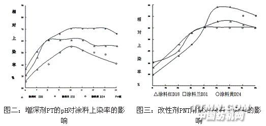 使用T、PT一定要用堿調節pH=9~10,而PNT不用調節pH。用環保型涂料改性劑PNT改性后生產的涂料彩色牛仔產品這種趨向變得緩慢甚至達到平衡。因此一般增深劑只需少量應用,用量控制在4—6%((o.w.f.))(見圖三)。