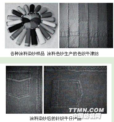 用涂料筒子紗通過針織廠做成彩色針織牛仔、T恤、運動衣褲,再經水洗,可獲得穿著更為舒適懸垂優良,抗皺免燙的彩色針織牛仔系列。