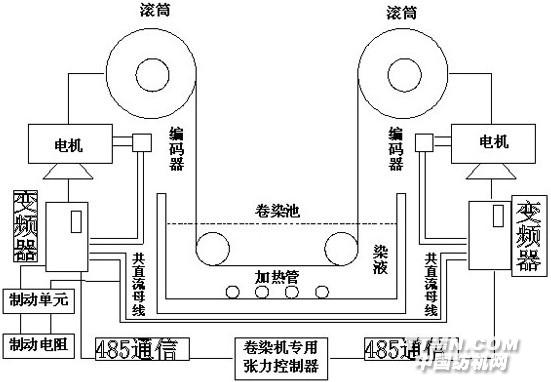 卷染機工作時,是一個中心軸卷曲控制系統。成品坯布首先通過上布電機勻速卷到其中的一個滾筒上,滾筒的傳動軸上安裝有計數用的接近開關(即滾筒每旋轉一卷,接近開關產生一個脈沖),此時卷染機專用張力控制器計下一整匹坯布的道數。上卷完畢后,采用人工的方式把布匹的一頭,穿過染池、連動軸,卷到另外一個滾筒上面并纏緊,開動卷染機,便可進行坯布的染色。此時兩個滾筒朝著同一個方向運轉,控制的要求是始終要保持坯布上的拉伸張力恒定,并且坯布經過染液的時間一致,也就是線速度要保持恒定。這是一個沒有線速度反饋,同樣,也沒有張力反饋的驅動控制系統,因此,控制系統需要適當調整放卷變頻器的輸出頻率來達到該種獨特的要求。 卷染機控制示意圖如下: