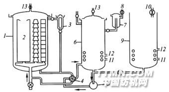 1—高壓染缸 2—纖維支架 3—染小樣機(jī) 4—四通閥 5—循環(huán)泵6—膨脹缸 7—加料槽 8—壓縮空氣 9—輔助槽 10入水管11—冷凝水 12—蒸汽 13—放氣口