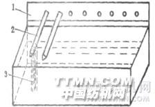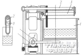 圖2-5 往復式染紗機 1—板 2—三角棒 3—絞紗 4—染槽