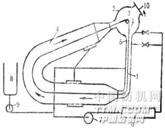 1—織物 2—主缸 3—導(dǎo)輥 4—U形染缸 5—噴嘴 6—熱交換器 7—循環(huán)泵 8—配料缸 9—加料泵 10—裝卸口