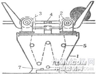 普通卷染機 1—染槽 2—卷布輥 3—布軸 4—換向齒軸 5—導布輥 6—間接加熱管 7—排液口