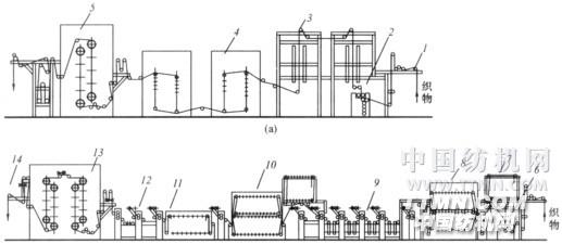 連續(xù)軋染機(jī) 1—進(jìn)布裝置 2、6—均勻軋車 3—紅外線烘燥機(jī) 4—橫導(dǎo)輥熱風(fēng)烘燥機(jī) 5—烘筒烘燥機(jī) 7—透風(fēng)輥 8—還原蒸 9—平洗槽 10—皂洗箱 11—長蒸箱 12—平洗槽 13—烘筒烘燥機(jī) 14—落布裝置
