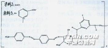 這是兩只分子結構很大的雙活性基染料,它們實際上是由乙二胺做橋基的雙活性基染料,乙二胺鏈是直接接在兩個均三嗪環上,和以往的這類染料有所不同,如前所示那樣,以往的雙煙酸均三嗪類染料的煙酸均三嗪活性基往往通過亞胺基接在染料芳環體系上,或者通過芳二胺將兩個活性基接在一起,即均三嗪環直接通過亞胺基接在芳環上,由于芳胺基給電子能力較脂肪胺基給電子能力弱,所以均三嗪環接芳胺基的活性染料反應性較強些,因此在堿性和高溫時容易水解。這可從前示圖2看出,當染色溫度升到130℃時,雙煙酸均三嗪結構的上染率已不到原來的一半,因此130℃染色時固色率提高不多。水解染料達130℃后幾乎成直線增加。為了克服這個缺點,近期研發的雙煙酸均三嗪染料則以脂肪二胺作橋基,由于它給電子能力相對較強,染料穩定性較好,在高溫下不易水解,另外,乙二胺鏈柔順性好,染料分子芳環共平面性較好,染料的直接性較高,加上此橋基的亞胺基的氫原子不易電離,性能穩定,所以這種結構的染料在130℃中性染色的固色率比芳胺橋基的有明顯提高,這也是近年來開發的許多活性染料以脂胺胺作橋基的主要原因。