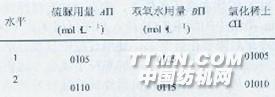 圖2氯化稀土氧化還原體系染色工藝曲線2結果與分析2.1 氯化稀土氧化還原染色工藝的確定 在弱酸性黃染料1%(owf)、滲透劑1.5g/L、元明粉1O%(owf)、pH值6、浴比1:50、染色時間1h的前提下,設定硫脲、雙氧水、氯化稀土的用量為變量,進行正交試驗。正交試驗因素水平見表1,結果見表2。表1 正交試驗因素水平表