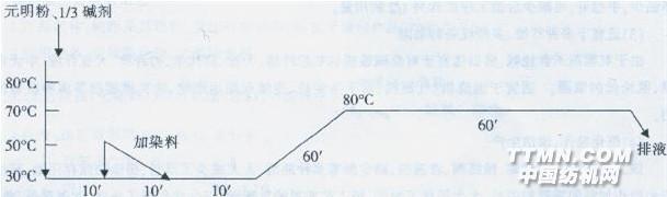 徐順成,趙四偉,劉培明,李樸素二、短流程活性染料預加鹽堿染色工藝 1.產品名稱:棉及其混紡、交織針織坯布 2.使用設備:溢流染色機 3.工藝流程:前處理后的坯布→加入元明粉,1/3堿劑→坯布運轉10分鐘后用10分鐘線性加入染料→運轉10分鐘后用1℃/min的速率升至50℃一60℃,運轉20分鐘后再用10分鐘線性加入2/3堿劑,保溫30分鐘→排液→水洗→酸洗→水洗→皂洗酶皂洗→水洗(對色)→柔軟。 4.工藝條件與升溫曲線 (1)適宜于適于乙烯砜活性基的活性染料