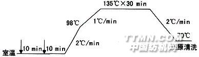 1 試驗1. 1 材料與藥品材料 純滌綸織物藥品 醋酸,磷酸二氫銨,N,N2二甲基甲酰胺,甘氨酸,氫氧化鈉, 硼砂(以上均為分析純),擴散劑NNO, C.I.分散黃54,C.I. 分散紅60,C.I.分散藍56(以上均為工業(yè)級)。1. 2 試驗儀器紅外線試色機(Rapid公司),722S分光光度計(上海精密科學儀器公司),SF600X電腦測配色儀(美國Datacolor公司) , Y571A型摩擦色牢度測試儀, SW224A型耐洗色牢度儀。1. 3 染色工藝處方及流程(1)酸性染色工藝/(g/L)分散染料/% (owf) 2擴散劑NNO 1磷酸二氫銨 2pH值(用醋酸調節(jié)) 4~5浴比 50∶1(2)堿性染色工藝/(g/L)分散染料/% (owf) 2擴散劑NNO 1pH值(用甘氨酸2氫氧化鈉調節(jié)) 8.5浴比 50∶1(3)皂洗配方/(g/L)皂片 2碳酸鈉 2浴比 30∶1
