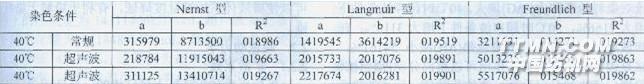 超聲波作為一種新的染色技術,具有其他染色方法無法比擬的優(yōu)點。超聲波染色技術被認為是一項方便、迅速、有效、安全的清潔生產(chǎn)技術,對建立節(jié)能、減排的染色方法具有重要的意義。雖然國內外關于活性染料上染棉纖維的染色機制以及超聲波對染料和纖維的作用已有報道,但是超聲波對活性染料上染棉織物的作用機制卻鮮見報道。本文以活性染料汽巴克隆紅LS26G染純棉織物為研究對象,從熱力學和動力學2方面來研究超聲波對活性染料上染棉織物的促進機制。1實驗部分1.1材料與儀器純棉平紋織物(1616tex xl813tex)。汽巴克隆紅LS26G(K型活性染料,汽巴精化公司杭州分公司);氯化鈉(AR,上海申翔化學試劑有限公司),平平加O(工業(yè)品1。LE021006S單槽一體式超聲波染色機(杭州力鴻超聲波科技有限公司,最大功率為01333W/cm2,頻率為28kHz),SHA2C數(shù)顯恒溫水浴振蕩器(常州國華電器有限公司),722S可見分光光度計(上海棱光技術有限公司)。1.2實驗方法1.2.1染色工藝(超聲波或無超聲波)工藝配方:活性染料X%(o.w.f);NaCl30g/L;平平加O 1g/L;染色溫度50℃;染色時間t;浴比1:500。超聲波處理條件:功率為01333W/cm2,頻率為28kHz。1.2.2上染百分率的測定采用殘液法,用722S型可見分光光度計測定吸光度,并按下式計算上染百分率。E=(1-Ai/Ao)×100%式中:Ai為染色殘液的吸光度;A0為初始染表1 不同染色條件下吸附等溫線擬合參數(shù)