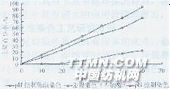 染料owfl%,平平加O 1g/L,浴比1:50,始染pH=6.42,室溫→75/90℃圖2弱酸性紅N-B的三種染色方法的上染曲線的比較