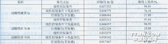 由表1可以看出,3只染料的3種染色方法的Sr值都較小,說明3只染色方法都具有較好的勻染性。其中3只染料的不加酸的常規(guī)染色的Sr值都比較小,并且比另外兩種染色方法的Sr值小得多,說明不加酸的常規(guī)染色的勻染性最好,但是,其最終上染率卻很低;進行pH控制染色時,3只染料都具有較好的勻染性及較高的最終上染率;進行pH控制條件下低溫染色時,3只染料都可以獲得較好的勻染性,弱酸性嫩黃G的最終上染率比pH控制染色的低20%左右,弱酸性紅N-B、弱酸性綠5GS的最終上染率基本可以與pH控制染色持平,基本可以獲得與pH控制染色相近的染色效果。3小結(jié) 弱酸性染料染真絲綢在pH控制條件下進行低溫染色時,上染曲線與pH控制染色的上染曲線的形狀基本一致。弱酸性染料在pH控制條件下進行低溫染色有較好的染色均勻性及較高的最終上染率。