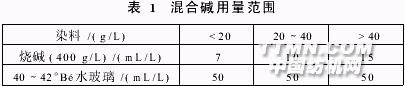 1 冷軋堆染色工藝1.1 材料 織物規(guī)格 145/147cm36.9tex×49.2tex425.2根/10cm×220.5根/10cm純棉織物 染化料 活性紅RGB、活性黃RGB、活性藍(lán)RGB、活性黑W?G、活性藏青GG、活性藍(lán)DSE,水玻璃,燒堿。1.2 工藝流程 前處理半成品→水洗→烘干→拉幅上卷→軋料(一浸一軋)→打卷→堆置(14~16h)→水洗→皂洗→水洗→烘干1.3 堿劑選擇 大量生產(chǎn)實(shí)踐試驗(yàn)表明,選用復(fù)合堿較為合理。水玻璃作為緩沖劑,能夠緩慢釋放OH-離子,提供穩(wěn)定的染液pH值,延長染液穩(wěn)定時(shí)間,提高固色率,染色成品顏色重現(xiàn)性好、色光穩(wěn)定。水玻璃用量過少,染液pH值不穩(wěn)定,色光易波動;用量過多,則會增加水洗困難,造成織物手感發(fā)硬。所以,一般采用半硅法工藝,40~42°Bé水玻璃用量50mL/L(采用全硅法時(shí)水玻璃用量為95mL/L)。為便于生產(chǎn),將混合堿用量分成三個(gè)濃度范圍,見表1。