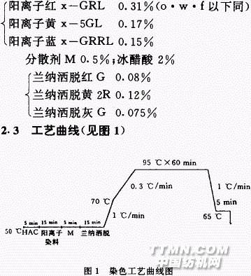 1 毛腈織物染色概況 我公司生產的毛腈抽條雙面絨,含腈90%,含毛10%。染腈采用國產陽離子染料,染毛采用牢度較好的進口蘭納灑脫染料,采用一浴溢流染色。由于腈綸占的比例較大,相應的染浴中陽離子染料占的比例也大,容易染花的是腈綸部分,所以修正色花針對腈綸進行。 國產陽離子染料色譜齊全,顏色鮮艷,給色量高,所以腈綸中深色一般采用國產陽離子染料染色。陽離子染料與腈綸纖維有較大的親和力,特別在玻璃化溫度附近,若升溫速度控制不好,很容易染花。又因為陽離子染料的擴散性、移染性都很差,所以一旦染花很難糾正。
