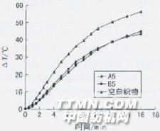 圖7涂層物用量為22.5%時織物的隔熱性能 由圖3~圖7知,織物不論是經(jīng)二氧化鈦還是氧化鋅涂覆后,隔熱性能均較明顯。在熱輻射前12 min,同一用量下,二氧化鈦涂層織物內(nèi)側(cè)溫度的增加量大于氧化鋅涂層織物;當功能粒子用量低于14%時,測試時間內(nèi),氧化鋅涂層織物內(nèi)側(cè)溫度的增加幅度始終小于二氧化鈦涂層織物,其隔熱性能優(yōu)于二氧化鈦涂層織物;當功能粒子用量大于14%時,輻照時間超過12 min,氧化鋅涂層織物內(nèi)側(cè)溫度的增加幅度大于二氧化鈦涂層織物,其隔熱性能較二氧化鈦涂層織物差。 上述現(xiàn)象可能與二氧化鈦的禁帶寬度(Eg為3.2 eV)比氧化鋅的禁帶寬度(Eg為3.3 eV)小,以及與二氧化鈦表面含有羥基有關。當受到同等強度熱輻射時,二氧化鈦更易吸熱產(chǎn)生電子能級躍遷,從而釋放出熱量,故起始時其涂層織物內(nèi)側(cè)溫度增加量大于氧化鋅。隨著輻照時間的延長,氧化鋅吸收的能量也足以使其產(chǎn)生電子能級躍遷,這時功能粒子對熱輻射的反射功能占主導地位。由于二氧化鈦的折光指數(shù)大于氧化鋅,經(jīng)其涂層后的織物,對近紅外熱輻射的反射作用,大于經(jīng)氧化鋅涂層后的織物,其隔熱性能也優(yōu)于氧化鋅涂層織物。在低用量下,功能粒子對熱輻射的吸收占主導地位,所以二氧化鈦涂層織物的隔熱性能不如氧化鋅涂層織物;隨著用量的增加和輻射時間的延長,功能粒子對熱輻射的反射作用逐漸占據(jù)主導地位,所以二氧化鈦涂層織物的隔熱性能優(yōu)于氧化鋅涂層織物。 當用量低于18%時,隨著功能粒子用量的增加,在同一測試時刻,涂層織物內(nèi)側(cè)溫度的增加幅度明顯下降,涂層織物的隔熱性能增強。這可能與涂層中功能粒子的數(shù)量有關。在低用量時,涂層中所含的功能粒子數(shù)量少,與紅外光子發(fā)生相互作用的幾率低,發(fā)生散射作用的機會就少,所以紅外透過多而反射少。隨著用量的增加,涂層中所含的功能粒子數(shù)量增加,與紅外光子發(fā)生作用的幾率增加,則散射作用增強,紅外反射率增.jpg)