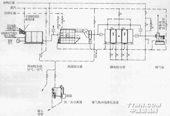 在2004年秋季.德國(guó)Gerhardvtln Clewe公司從德國(guó)Bruckner烘干技術(shù)公司定購(gòu)了一套通用7段單層Power-Line拉幅機(jī),專門用于涂層、烘干和熱定型工藝。由于經(jīng)濟(jì)原因并確保滿足單層拉幅機(jī)操作授權(quán)的規(guī)則和條件,該公司同時(shí)也安裝了帶有如下Bruckner部件的全套三步驟排氣處理系統(tǒng) Eco-Heat熱回收系統(tǒng)(步驟1),帶有集霧氣的AIR-CLEAN渦流空氣除塵器(步驟2)和帶有自動(dòng)清潔單元的AIR—CLEAN兩步靜電除塵器(步驟3)(圖1)。