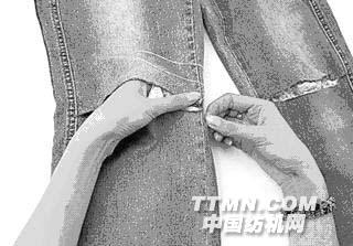 ■材料:舊牛仔褲、白色蕾絲花邊工具:剪刀、針、線 ■步驟一:用剪刀在褲腿膝蓋前片橫向剪開 ■步驟二:把剪成同等大小的蕾絲花邊與剪開處縫合
