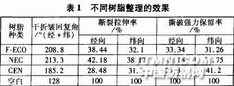 2 結果與討論2.1 單因素分析2.1.1 不同樹脂整理的影響不同樹脂對整理效果的影響結果見表1。