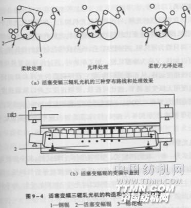 (1) 軋光整理軋光機主要由重疊的軟硬輥筒組成,輥筒數目分2~10根不等,可根據不同整理要求,確定軟硬輥筒數量與排列方式。織物穿繞經過各輥筒間軋點,即可燙壓平整而獲得光澤。 軋光時硬輥筒加熱溫度為80~110℃,溫度愈高光澤愈強,冷軋時織物僅表面平滑,不產生光澤。 織物經過給濕后平幅通過軋光機,經濕熱壓作用,使織物光澤增加,手感柔軟