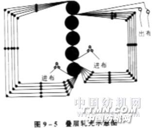 疊層軋光 五輥以上軋光機,如配備一組6~10套導輥的導布架,即可選行疊層軋光,利用織物多層通過同一軋點相互壓軋,使紗線圓勻,紋路清晰,手感柔軟,有似麻布光澤,
