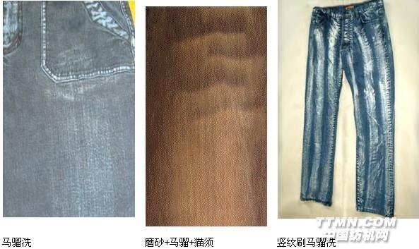 服裝水洗行業,把牛仔服的一種新的水洗風格親切地叫作"馬騮洗"(猴仔),其特色是;局部褪色,邊緣不清.加工方法可以用噴砂,噴霧,帶有褪色液的噴砂;也可以用手工操作,隨意繪制圖案.褪色液也叫"馬騮洗水",用高錳酸鉀水溶液就可以.