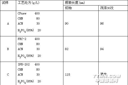 工藝條件:二浸二軋,軋余率75%,焙烘:16O℃ 3min,堿洗Na2CO3 12g/L,40-5O℃ 3min通過小樣實驗,確定B樣工藝為生產處方。2·1·3阻燃機理阻燃劑FRC-2化學名為N-羥甲基磷酸基丙烯酰胺,為純棉織物耐久阻燃劑。其阻燃機理是,FRC-2在高溫時迅速分解成有機磷酸酐或磷酸,使棉纖維脫水炭化,同時,磷酸酐在熱裂解中形成類似玻璃狀的熔融物覆蓋織物,促使有機物直接氧化成CO2,抑制易燃性氣體的產生;其次,FRC-2與纖維素的鍵合物直接改變了纖維素高溫下熱裂解的固有歷程,阻止了左旋葡萄糖的形成,脫水生成不飽和雙鍵使得纖維素分子之間相互交聯,轉而演化為難燃的炭化狀物,不僅有效地抑制有焰燃燒的繼續進行,還具有防止陰燃的作用。2·1·4工藝流程 染色(印花)半成品→浸軋阻燃整理工作液(二浸二軋,軋余率80%)→預烘→烘干→焙烘(160℃,2min)→堿洗(Na2C03 12g/L)→水洗→烘干→拉幅→預縮2·1·5工藝處方 FRC-2 400g CHN 8