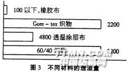 防風性 由風洞測試結果表明;在25M/sec的大風中,Gore-tex織物的保溫性比傳統的羽絨服提高30-40 %。織物的透氣性由GN值表示,GN值是在124mm水柱的壓力水,l00cm3空氣通過l cm2面積所需的時間(sec)數。幾種不同材料的透氣性(GN)如表6所示。