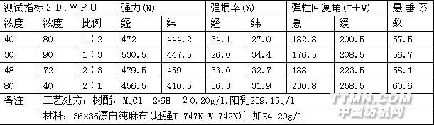 2.結果與討論:2.1. 2D與WPU用量的影響2D與WPU兩種樹酯整理劑整理效果如表1..從表1中可看出,單獨使用2D時,彈性好、強損大,單獨使用WPU時,強損少,手感好。2D與WPU各半分配時,各項指標在二者之間。由于2D性能已為人們所熟知,增加用量只會增加強大的強損,那么增加WPU的用量,是否會使彈性提高呢?為此我們進行增加?。祝校沼昧康恼碓囼灒Y果如表2表1. 2D、WPU、2D/WPU整理效果比較: